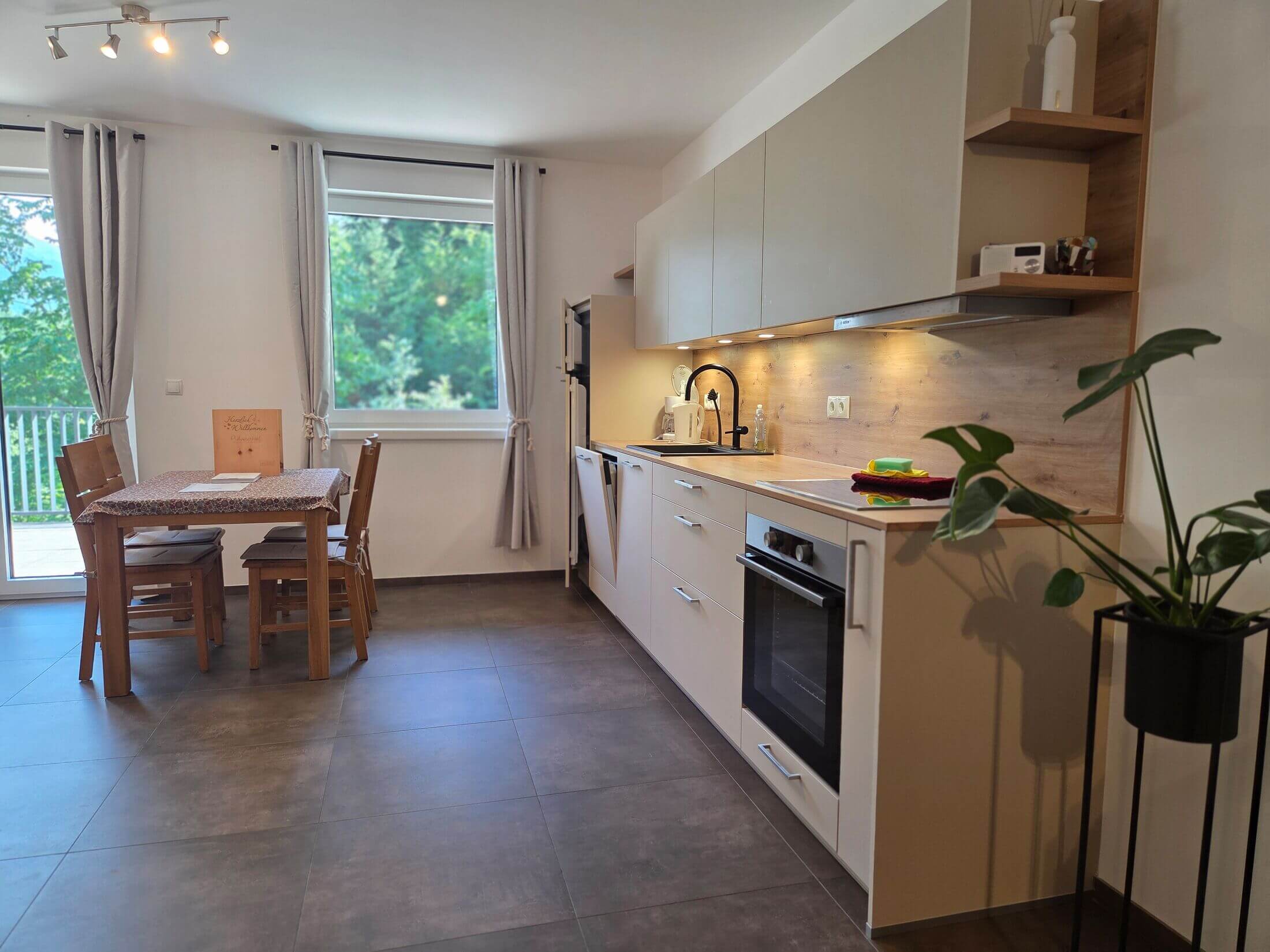- Voll ausgestattete Wohnküche: Herd, Backofen, Kaffeemaschine, Geschirr, Besteck