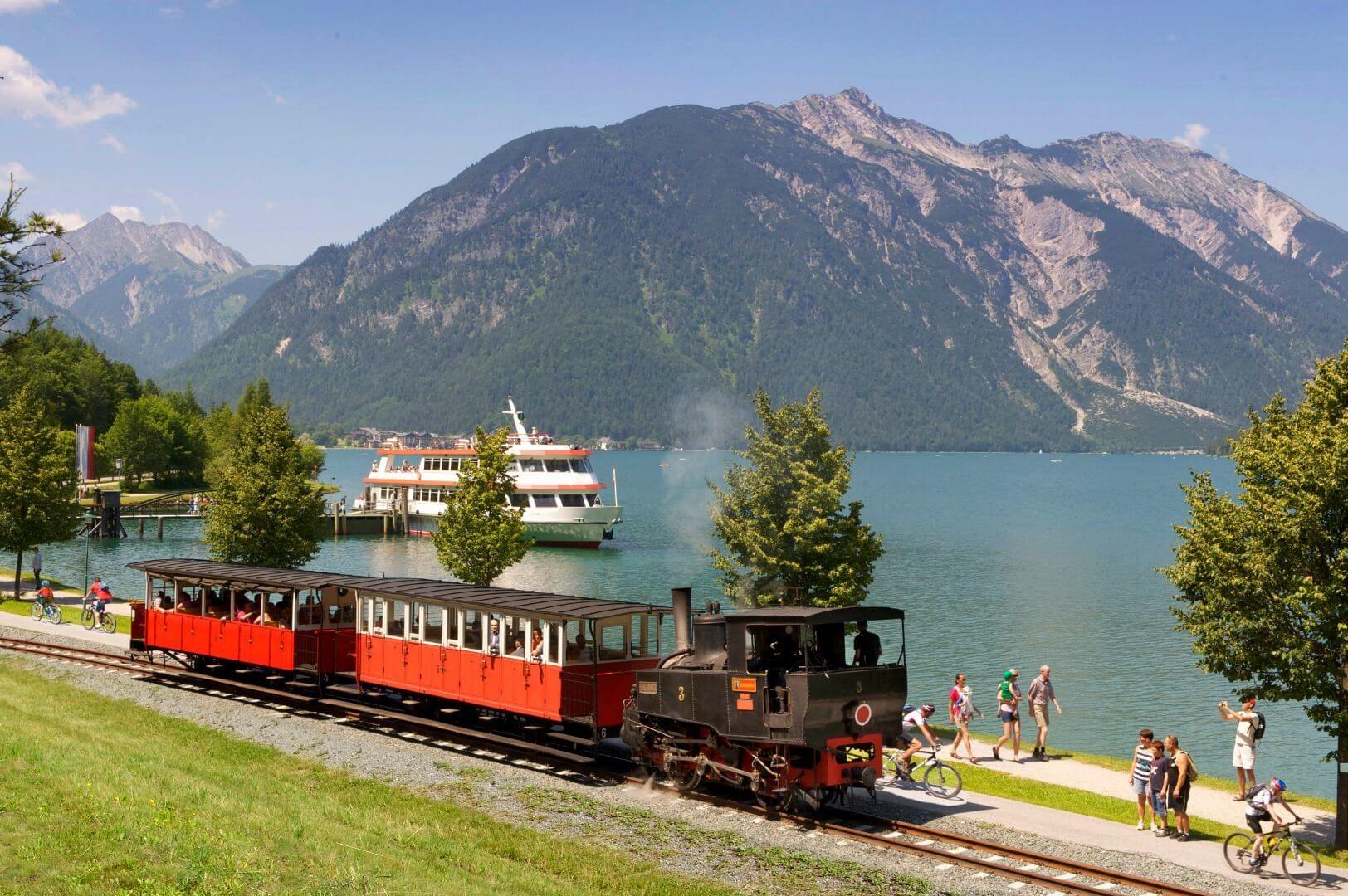 Ein echtes Abenteuer: Mit der historischen Dampfbahn fahrt ihr von Jenbach zum Achensee. Von dort wandert ihr am Seeufer entlang zur idyllischen Gaisalm, die nur zu Fuß oder mit dem Schiff erreichbar ist. Unterwegs gibt es Wasserfälle, Sandbänke und tolle Ausblicke. Zurück geht’s gemütlich mit dem Schiff – ein unvergesslicher Tagesausflug für die ganze Familie.