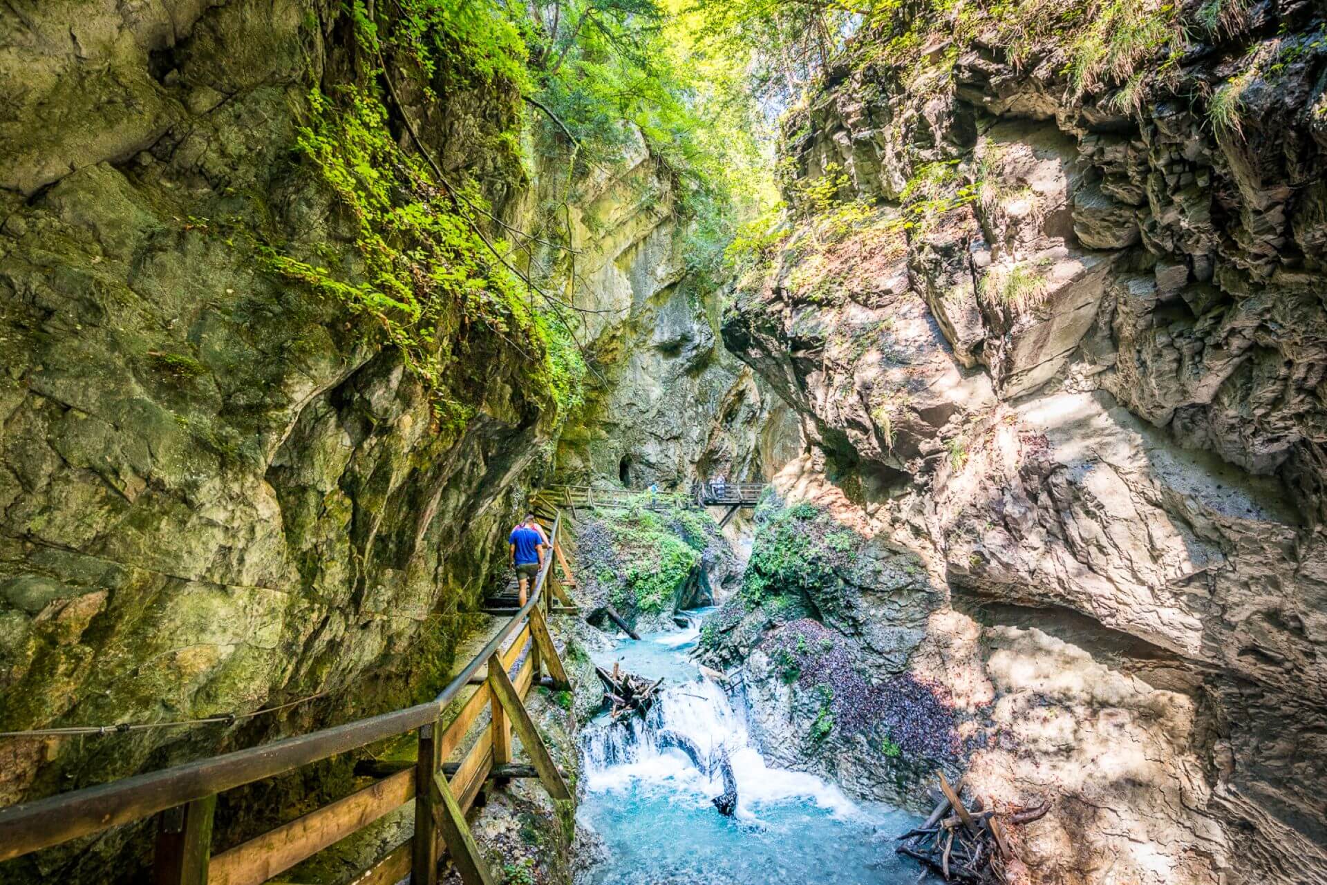 Die Wolfsklamm bei Stans ist ein echtes Naturwunder. Auf Holzstegen und Stufen wanderst du durch eine wilde Schlucht mit tosenden Wasserfällen, smaragdgrünem Wasser und beeindruckenden Felsen. Die Wanderung ist ein Abenteuer für Groß und Klein und führt dich bis zum Felsenkloster St. Georgenberg, dem ältesten Wallfahrtsort Tirols. Unterwegs kannst du immer wieder rasten, spielen und die Kraft des Wassers hautnah erleben – ein unvergessliches Erlebnis für die ganze Familie.
